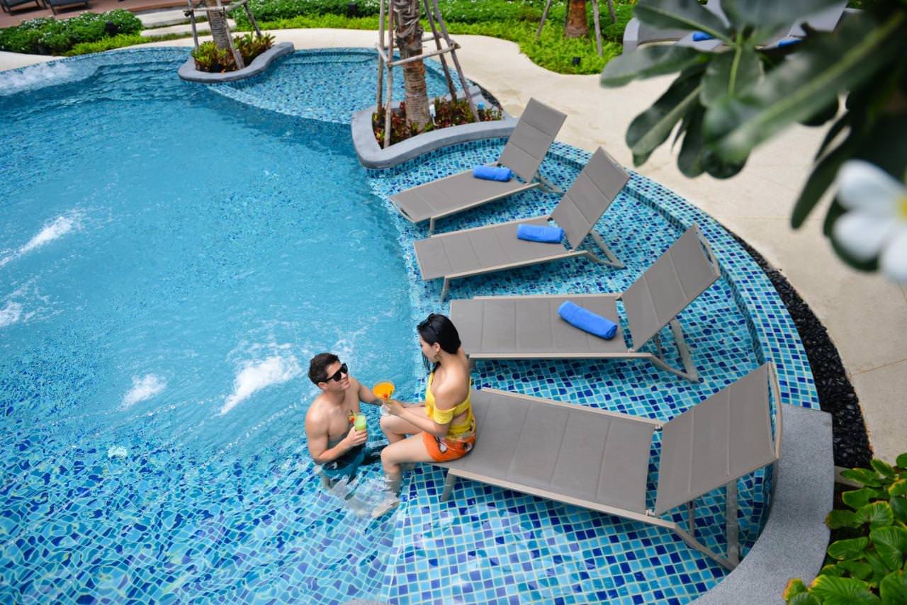 客室は30平方メートルを超える広さで、モダンで実用的なデザインが施されています。日本のテレビ番組も視聴可能で、日本人旅行者にとって嬉しい特典です。さらに、バルコニーとプールビュー付きの客室からは、美しいトロピカルビューをお楽しみいただけます。プールの周りにはヤシの木や緑が配置され、日中はリラックスするのに最適な空間となっています。